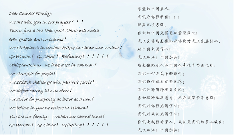 在武漢的埃塞俄比亞學(xué)生發(fā)出的慰問(wèn)信